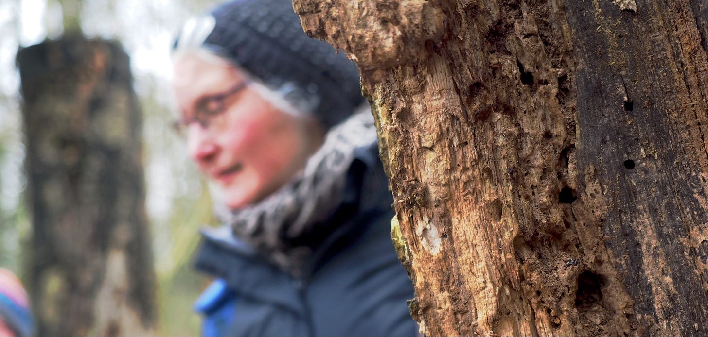 A wood changes over time, thanks to human interference and natural opportunism. Here’s a dead tree with scores of beetle holes: Ian digs out a handful of crumbly brown ‘beetle poo’ as he puts it, where the larvae of perhaps Lesser Stag or Rhinoceros Beetles have defecated chewed up wood which, together with beetle loving fungi, will slowly return the tree to the woodland floor.
