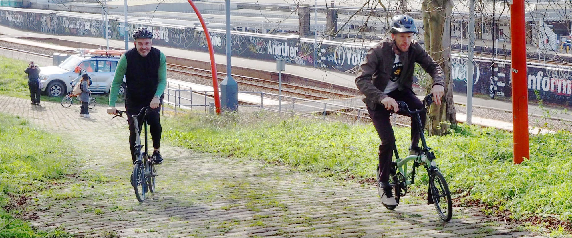 “I’ve cycled along cobbles before, but not on a Brompton,” he said, facing the hostile cobbled climb towards Park Hill flats from the race start line, yards away from the now publicly owned Supertram network above the station.