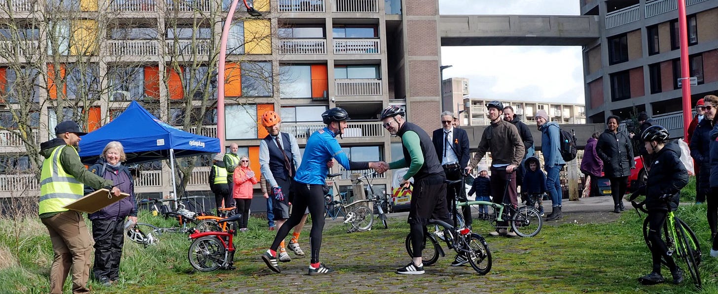 The race was part of the Urban CX series, raising money for the Roundabout and Work Ltd charities in the city. Clancy had managed a wheelie over the finish line on his practice run, but both he and Coppard were struggling with the ‘fold and unfold a Brompton in record time’ aspect of the event, a key component of Brompton races across the world.