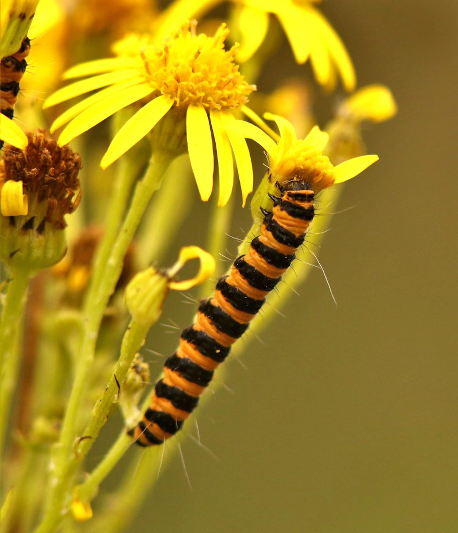 These spectacular caterpillars were once known as ‘Football Jerseys’ back when football teams went for bright colours rather than sponsorship deals. It’s a member of the Tiger Moth family, and eats the bright yellow Ragwort plant, where you can see it now on waste ground, meadows and moorland edges.
